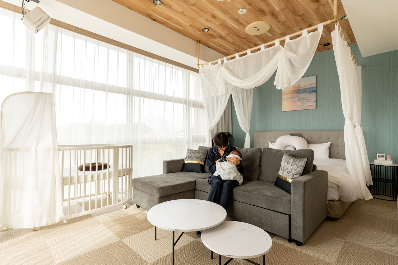 マームガーデンリゾート葉山は、産後お子様が1歳になるまでのご家族が滞在できます。24時間いつでも赤ちゃんをお預かりできるベビールーム、助産師による授乳サポート、ベビーマッサージなどの育児講座、1日5食の栄養食など、さまざまな面から産後のママをケアします。全47室のホテルは高台にあり、客室からはオーシャンビューや葉山の自然を楽しむことができます。岩盤浴や足湯、スパもあるんですよ。だから、リゾートのように滞在を楽しんでいただけます。産院退院後に病院からそのまま来られて、2週間ほど滞在される方が多いです。もちろんパパも上のお子さまも一緒に泊まることができます。