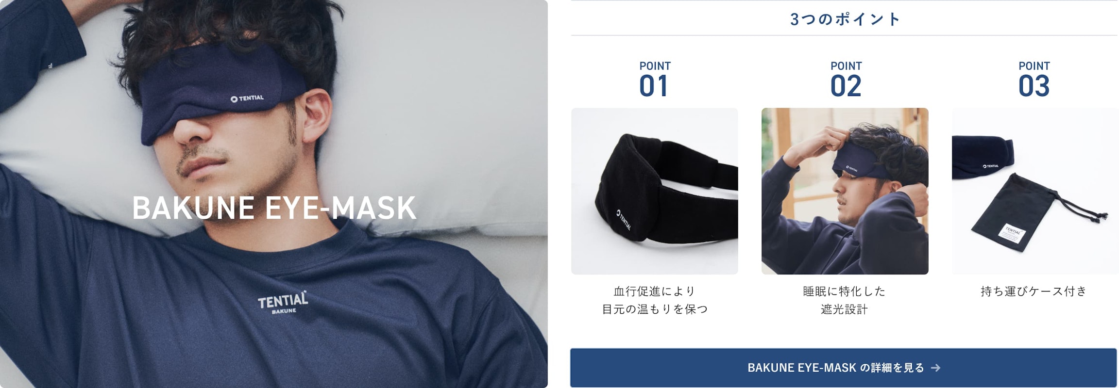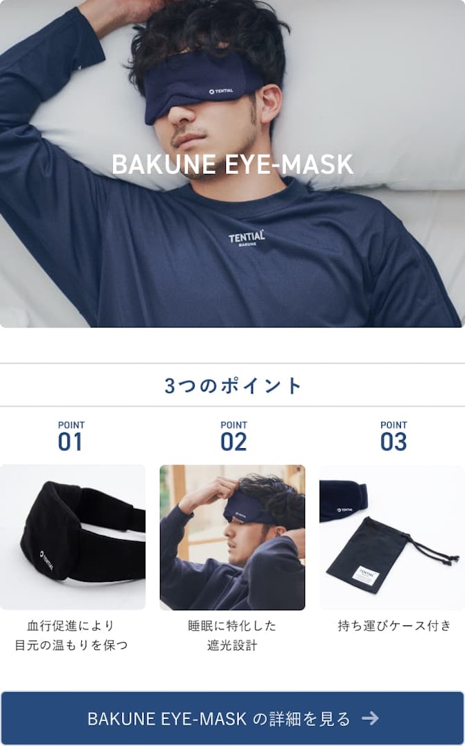 「BAKUNE EYE MASK」は、特殊機能繊維による血行促進で目元の温もりを保ち、