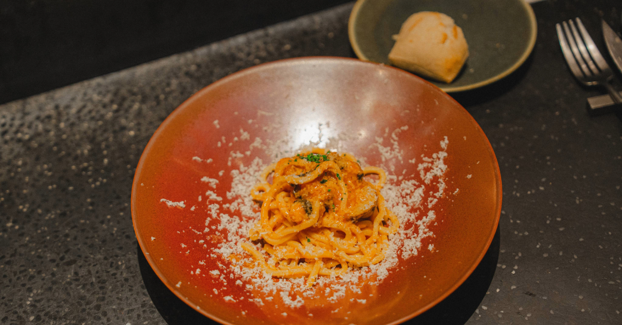 次に運ばれてきたのは、「真蛸とホタテのトマトソースパスタ~蜆の出汁を効かせて~」。