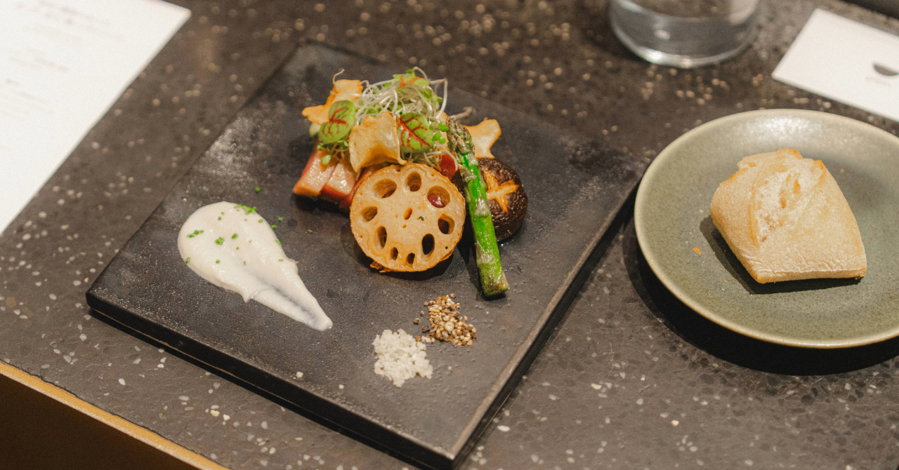 続いて登場したのは、「マグロのたたき 蕪のソース」。グリルしたレンコン、しいたけ、アスパラガス。そして上には菊芋のチップス、ブロッコリースプラウトが華やかに添えられています。