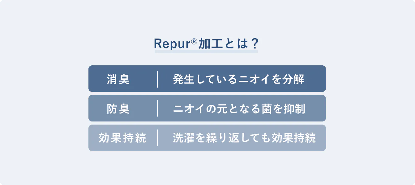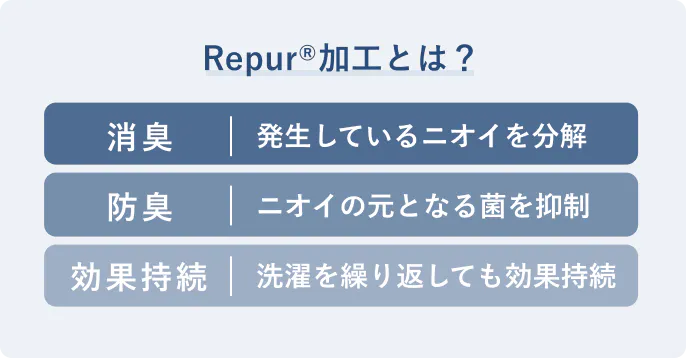 吸汗速乾と通気性を備え、汗によるムレやベタつきを軽減。また抗菌防臭効果を持つリピュール加工を採用。一日中、クリーンで快適なコンディションを保ちます。