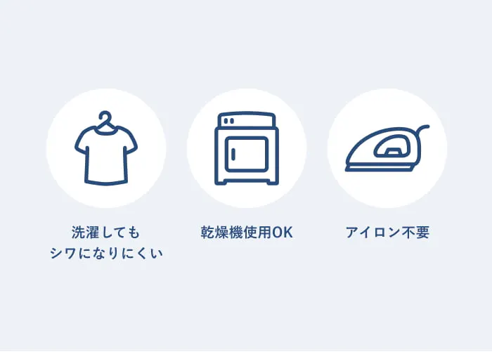 耐洗濯性に強いポリエステル素材を使用することにより、ニット素材でありながらシワになりにくく、乾燥機の使用もOK。シワになりにくく、お手入れにかかる時間を大幅に削減します。忙しいあなたの日常をサポートし、日々の生産性向上に貢献します。