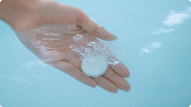 血行促進に重要な重炭酸イオンを高濃度でお湯に溶け込ませることができるよう、独自製法で製造。