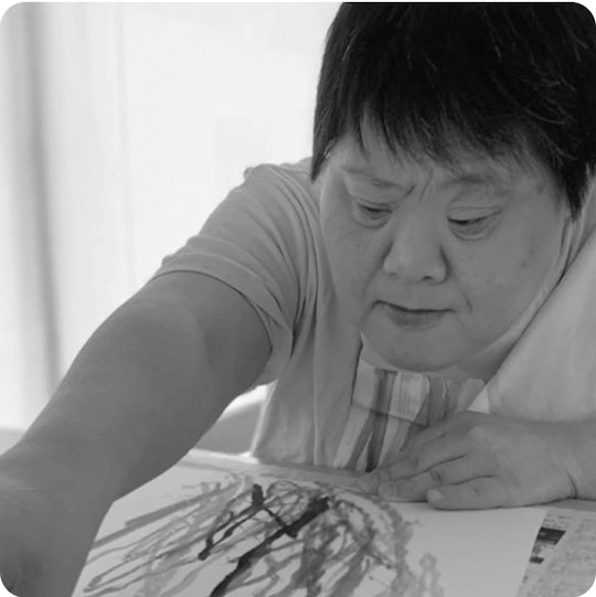 笹山の制作は、スタッフが声を掛けることではじまる。「どうぞ」という一言をきっかけに、彼女は伸びやかに筆を走らせていく。力強い丸や、色とりどりな線。一本一本丁寧に、ぐっと力を込めて、 机を覆うように着席した彼女の胸元から外側に向けて線は引かれる。 多くの作品は、筆跡が紙からはみ出ており、彼女の力強さとおおらかさが表れている。