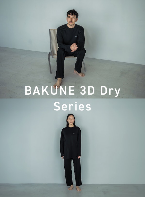 リカバリーウェアBAKUNE Dryが進化した、BAKUNE 3D Dryが登場。サイドに編み目がない3D構造で、より快適な睡眠をサポートします。