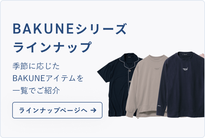 リカバリーウェアBAKUNEは、着るだけで血行を促進し、疲労回復することで健康的な毎日を支える機能性パジャマ。さらに快適な眠りに特化した独自の設計で、毎日の健康に重要な「睡眠環境」をサポートします。