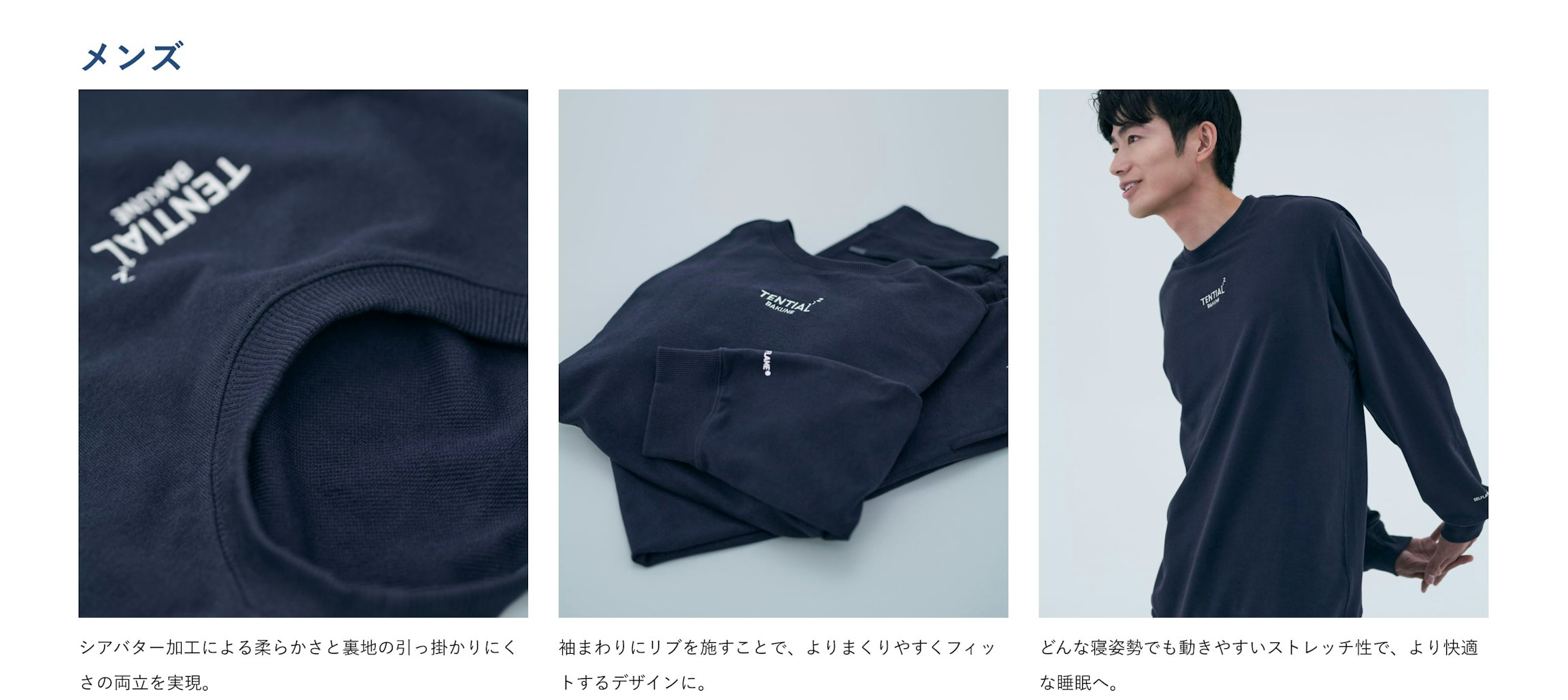疲労回復パジャマ(リカバリーウェア)。血行を促進し、疲労回復をサポートする特殊繊維と、寝返りを打ちやすい設計。
