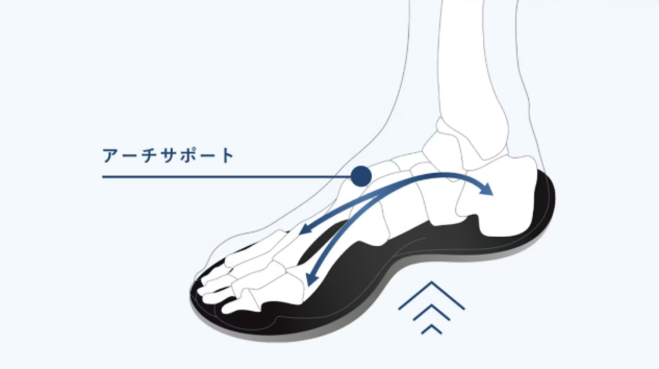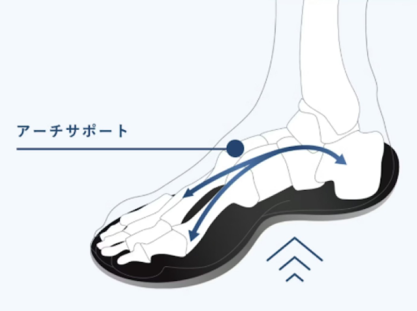 土踏まずを持ち上げ、体のバランスをサポートするアーチサポート機能を採用し、歩行時の安定性を支えます。