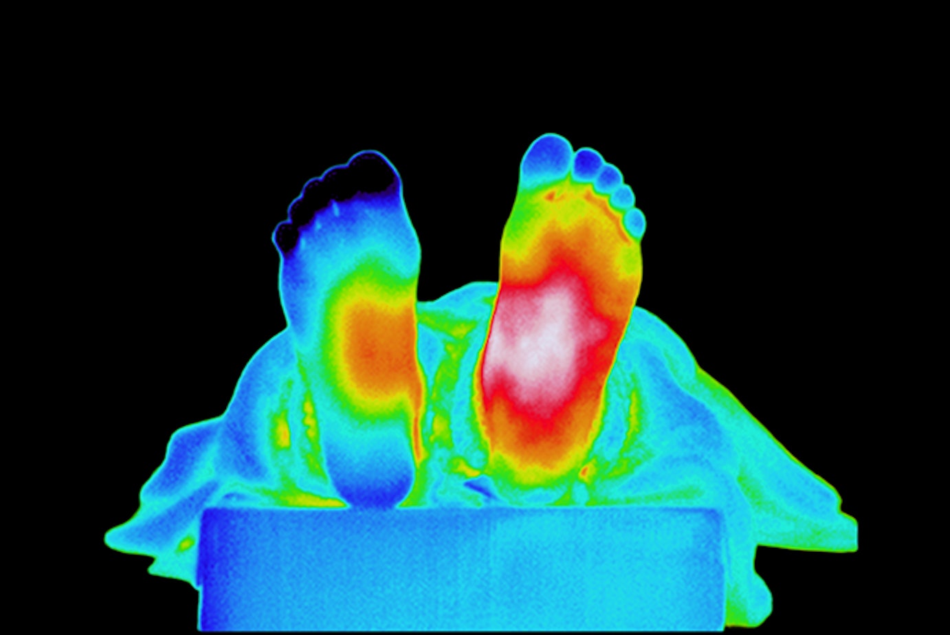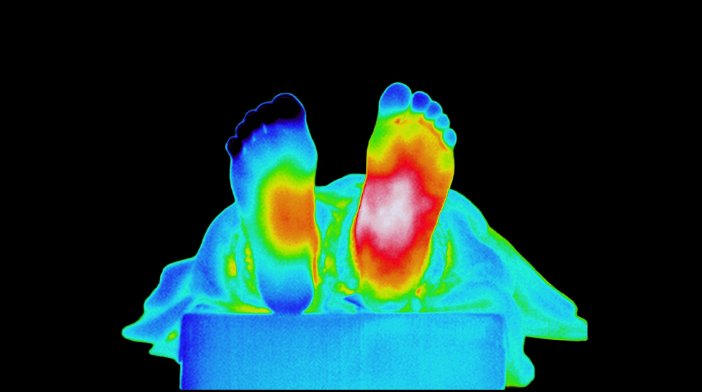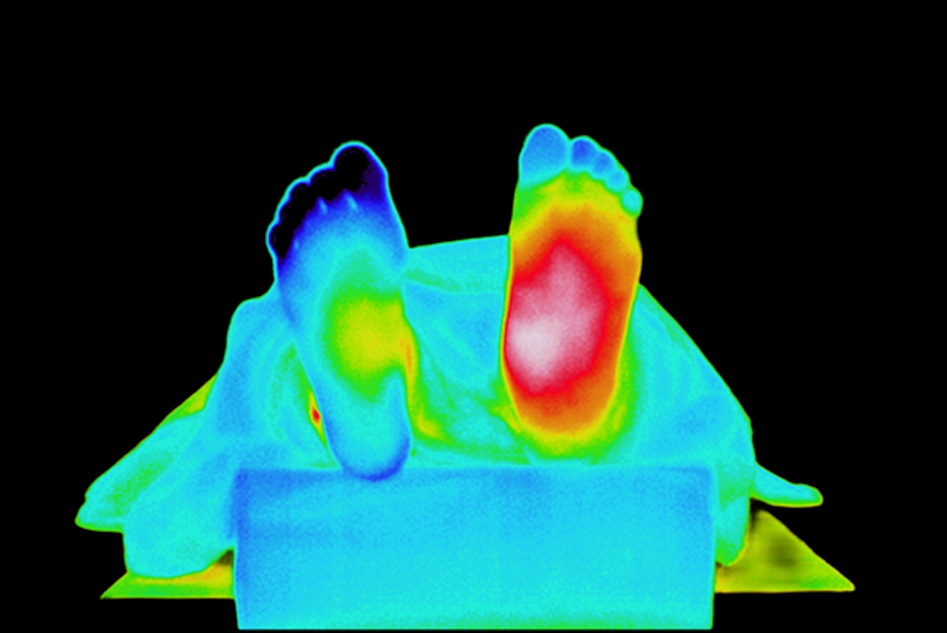 水につけて両足の温度を同程度にした後、片足だけリカバリーサンダルホームを着用させ、20分後の足をサーモグラフィーを用いて撮影しました。 寒い時期にも足を温かく保ちます。