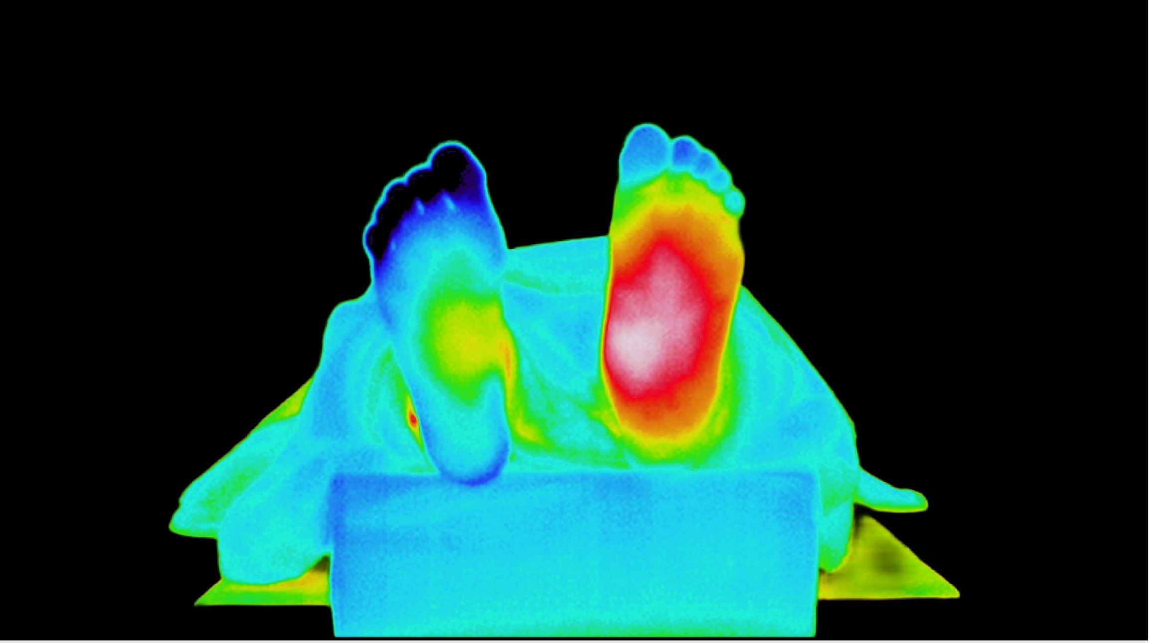 水につけて両足の温度を同程度にした後、片足だけリカバリーサンダルウォームを着用させ、20分後の足をサーモグラフィーを用いて撮影しました。