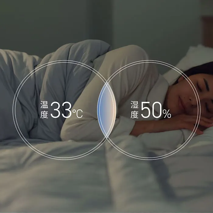 人が心地よく眠るためには、布団の中の環境がとても重要です。 寝床内の温度は 33°C、湿度は50%が最適とされており、このバランスが、 快適な眠りを支えて くれます。質のよい睡眠のためには、こうした理想的な環境を整えることが大切です。