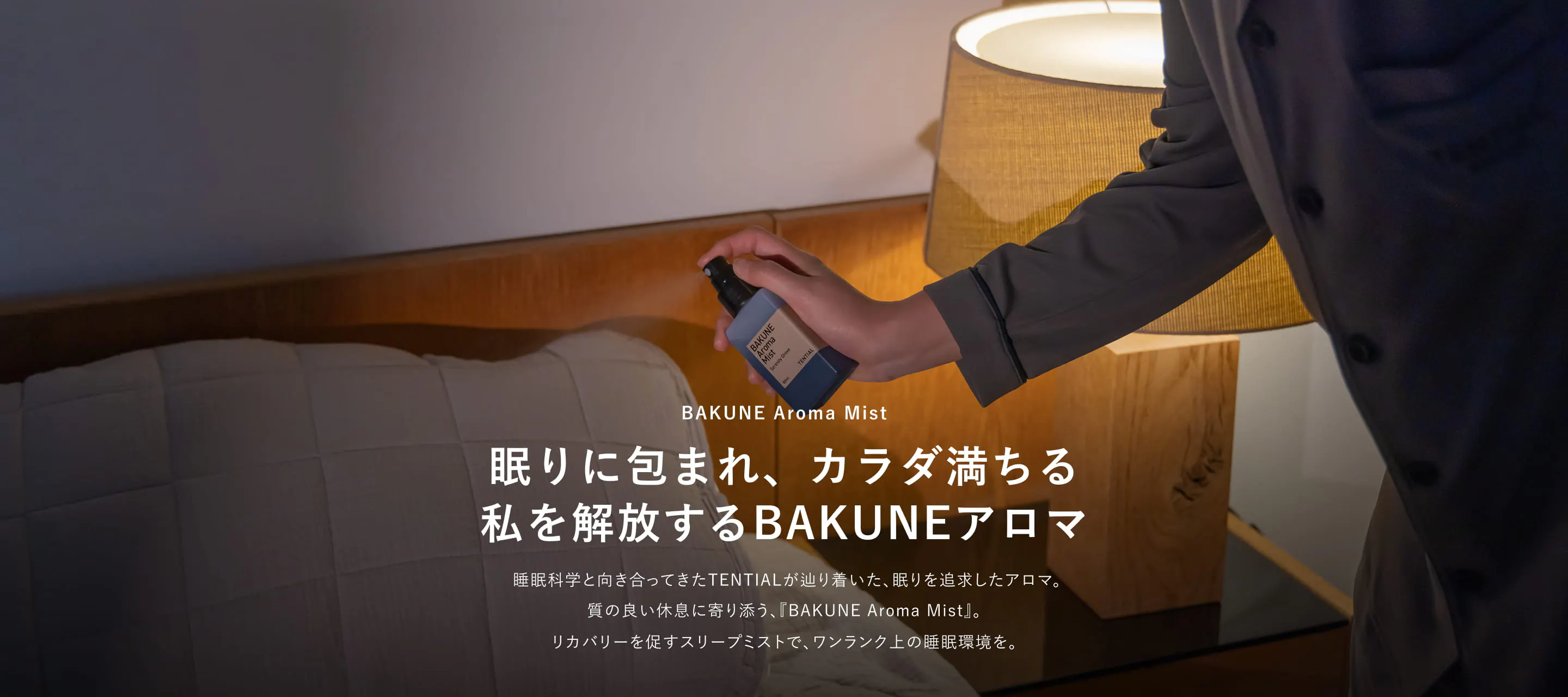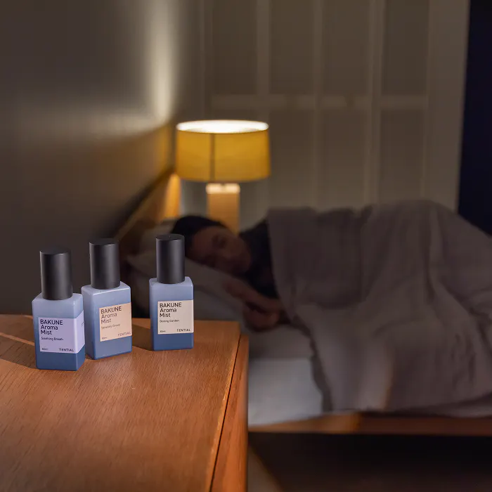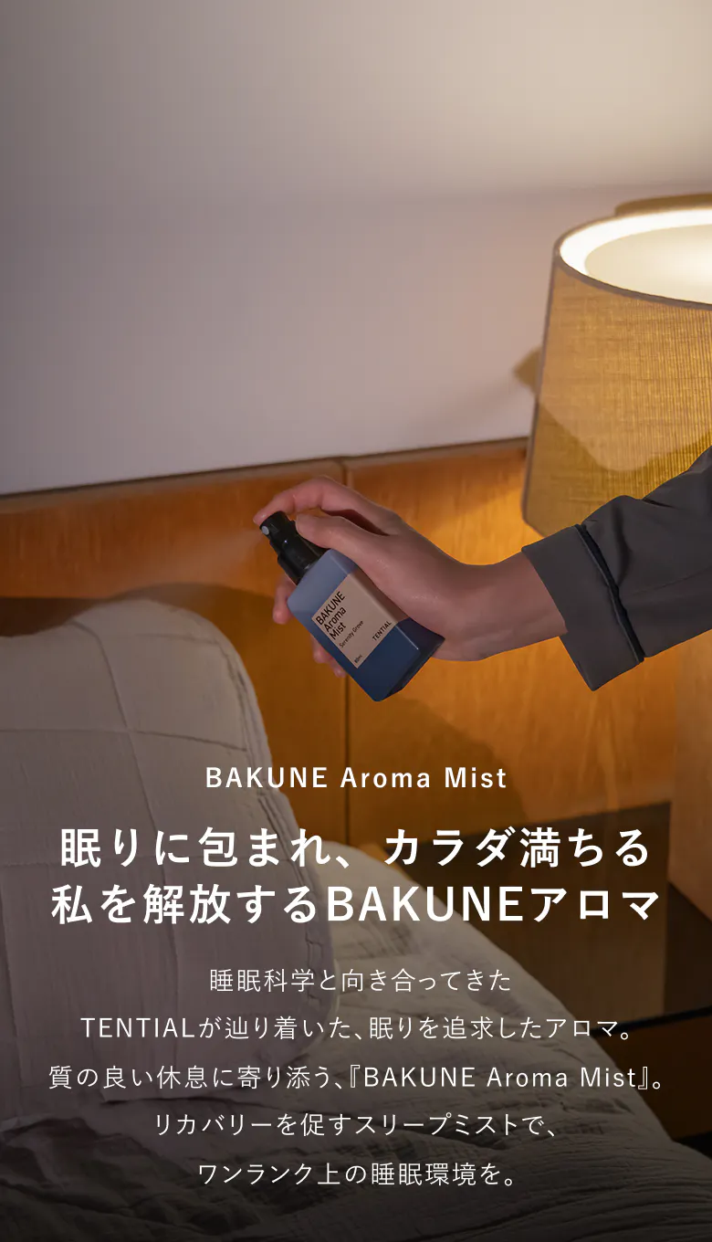 TENTIALのスリープミストは、眠りのことを考えて開発された独自のアロマブレンド。 睡眠と香りの関係に着目し、入眠前の安らぎの香りとして定番のラベンダー、ベルガモット、シダーウッドを配合。 何かとストレスの多いビジネスアスリートにとって、睡眠ケア商品を手軽に取り入れていただけます。