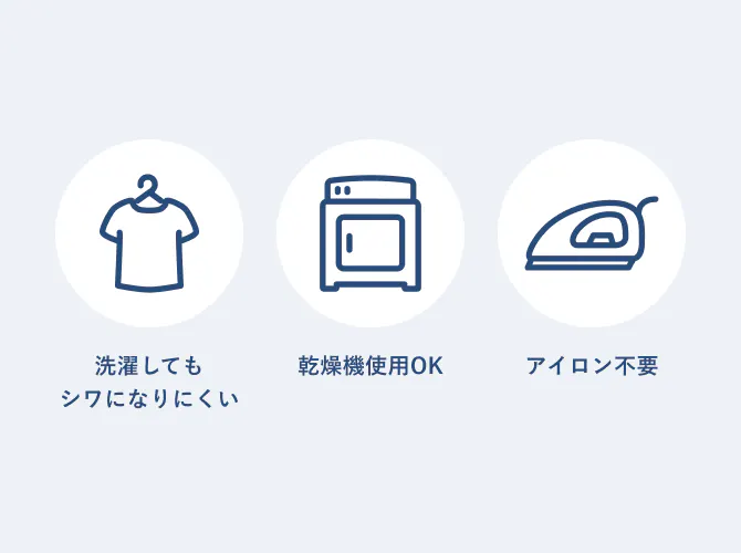 耐洗濯性に強いポリエステル素材を使用することにより、ニット素材でありながらシワになりにくく、乾燥機の使用もOK。シワになりにくく、お手入れにかかる時間を大幅に削減します。忙しいあなたの日常をサポートし、日々の生産性向上に貢献します。