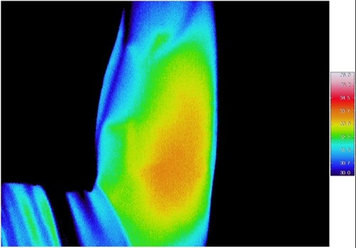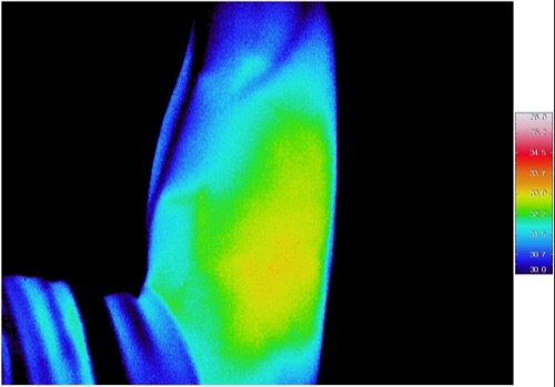 掛け布団クールを上腕にかける前、かけて約30秒後のサーモグラフィー画像を撮影