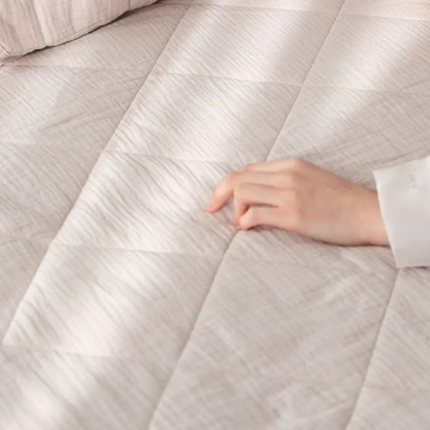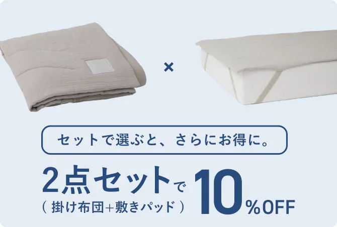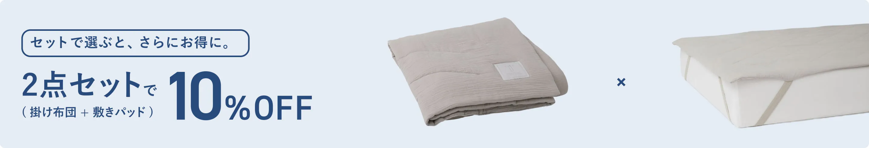 表地にはインド産のオーガニックコットンを使用し、柔らかく優しい肌触りが特徴な2重ガーゼに織り上げた素材を採用。 中綿には温度調整素材「THERMO FLEX®」を使用。また除湿素材「B型シリカゲル」を付着加工を施しています。