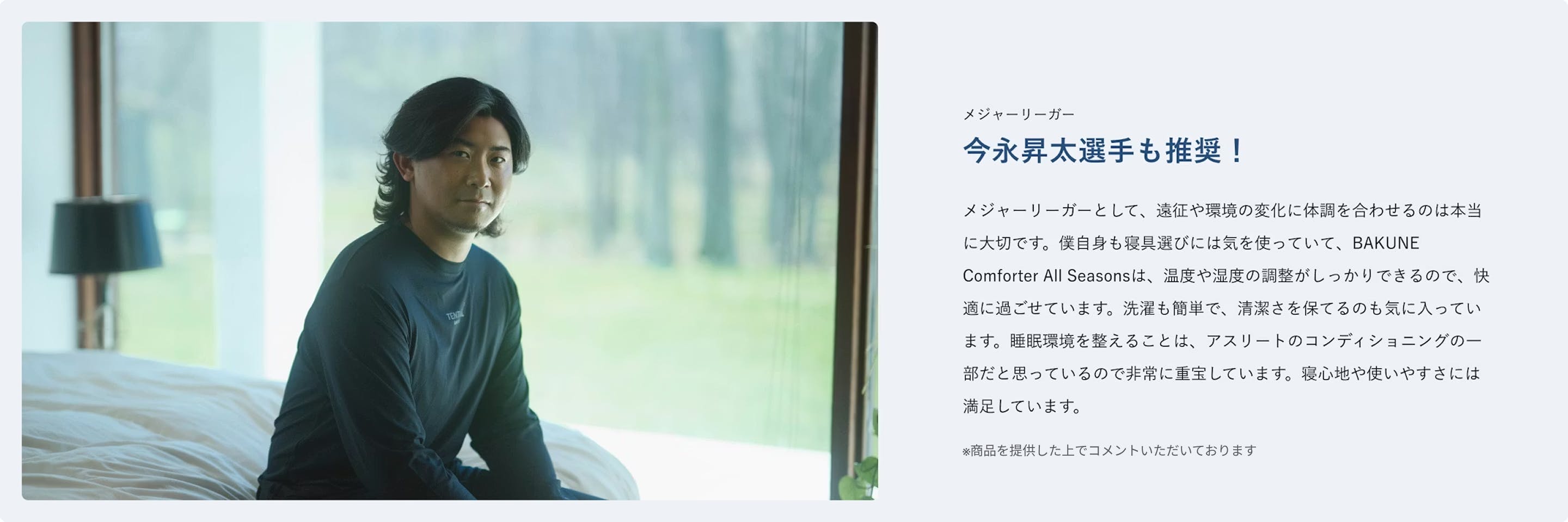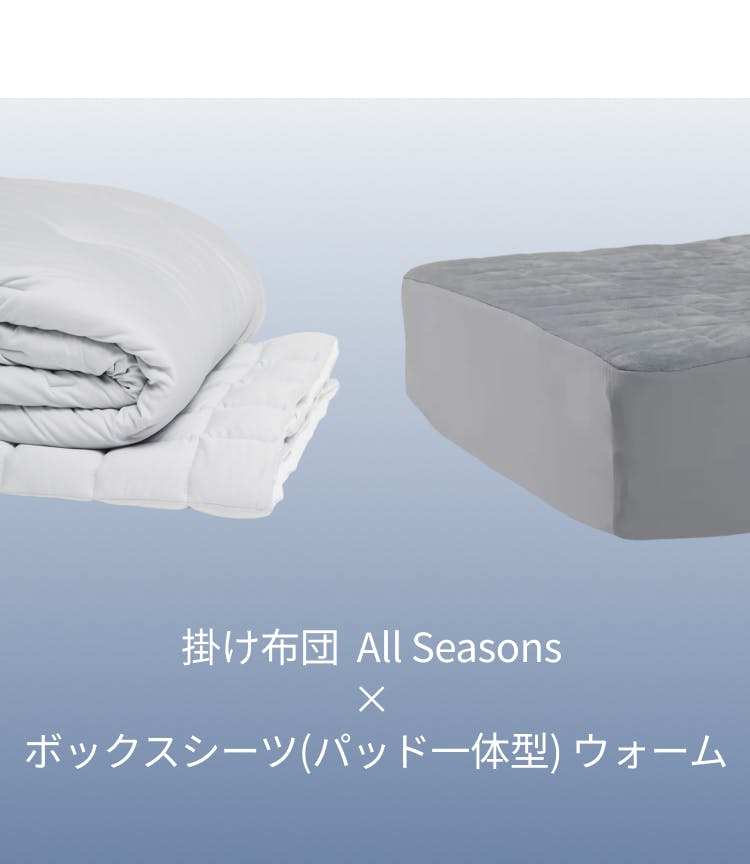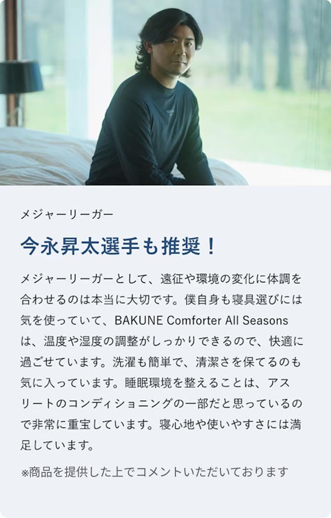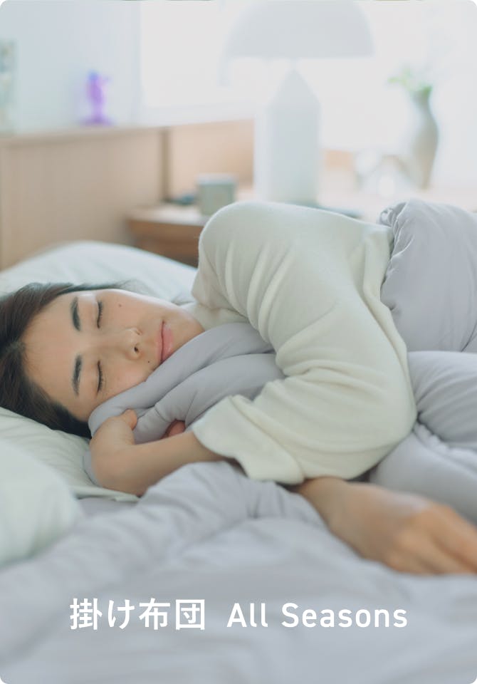日々、気温が変わりやすい季節の変わり目。 布団の中の温度や湿度が合わないだけで 眠りは意外と簡単にくずれてしまうもの。 「BAKUNE Comforter All Season」は、 軽やかな掛け心地で、重ね掛けのストレスを減らしながら、 寝床内の温度と湿度をバランスよく整える設計。 タオルケットでは頼りない。羽毛では暑すぎる。 そんな季節にこそ、ちょうどいい一枚です。 洗える手軽さと、オールシーズンの快適さで、 日々の眠りに、迷わない選択を。