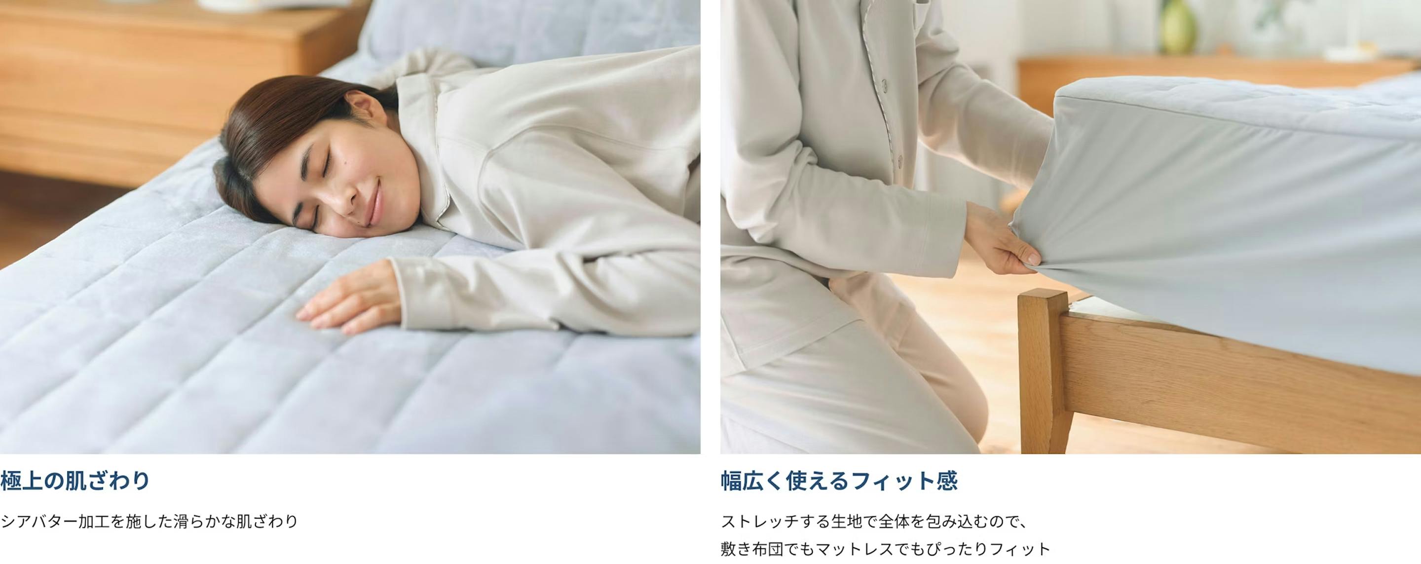 ボックスシーツと敷きパッドが一体化した5層構造が、 敷くだけでふわりと軽やかに、しっかりあたたかい眠りを実現。 温度と湿度を整える中わた素材で、 ムレも気にならず、快適な寝心地が続きます。 軽さとぬくもりの、ちょうどいいバランス。 体の下からやさしく支える一枚が、冬の眠りをもっと快適にします。