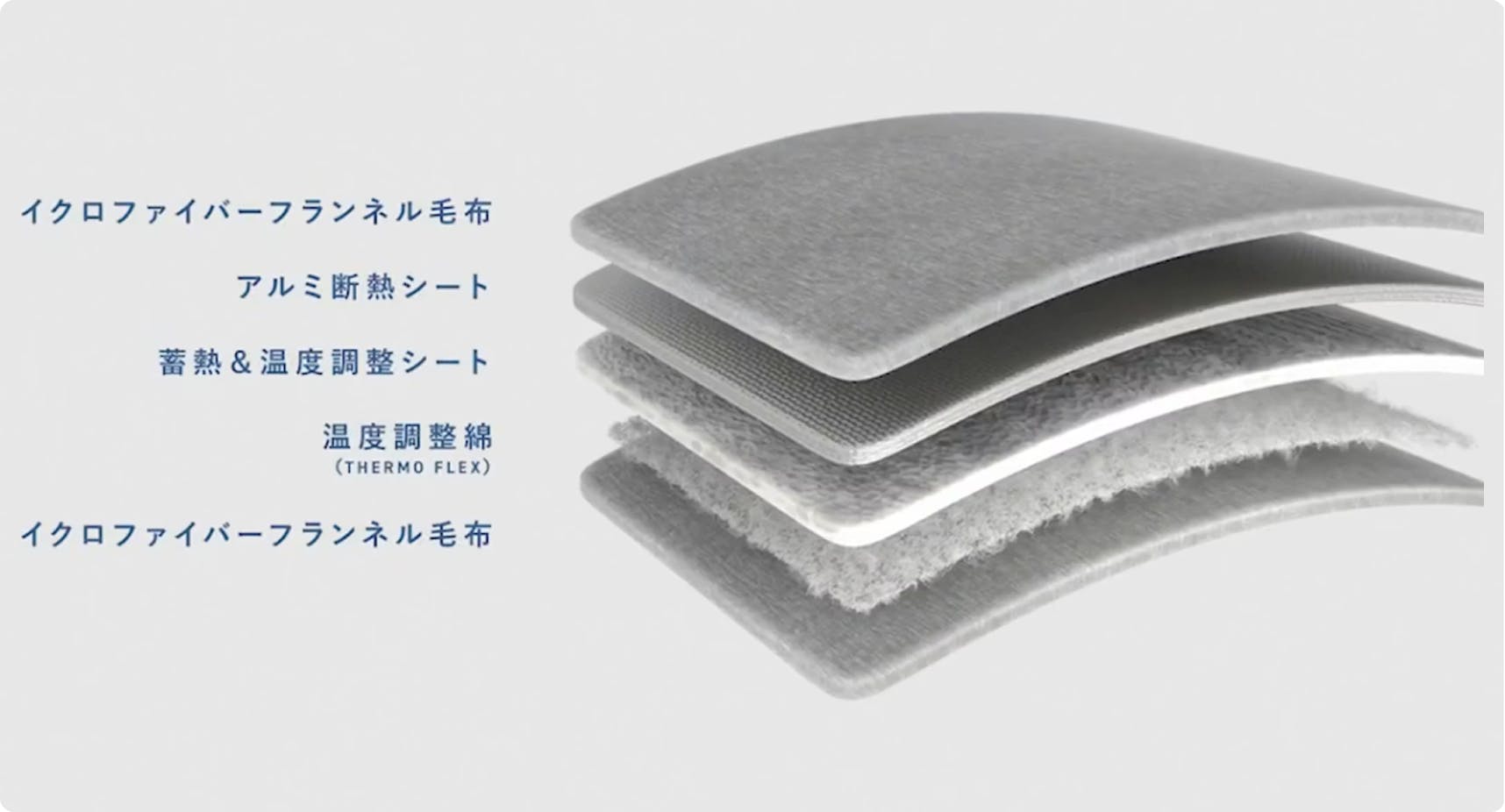 5層構造で仕立てた快適設計。 中わたには、熱を閉じ込めるアルミ断熱シート、湿気を吸収しながら保温する調整シート、さらに温度調整素材「THERMO FLEX®」を採用し、ムレにくく快適な温もりを実現。 表地にはシアバター加工を施したマイクロファイバーフランネル毛布を使用し、やわらかくなめらかな肌触りに。裏地には滑り止め加工を施し、ズレにくく安心してお使いいただけます。