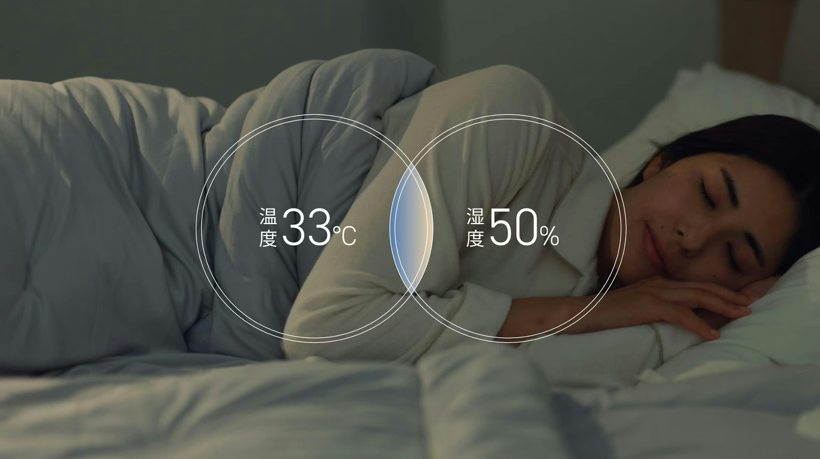 人が心地よく眠るためには、布団の中の環境がとても重要です。寝床内の温度は33℃、湿度は50%が最適とされており、このバランスが、快適な眠りを支えてくれます。質のよい睡眠のためには、こうした理想的な環境を整えることが大切です。