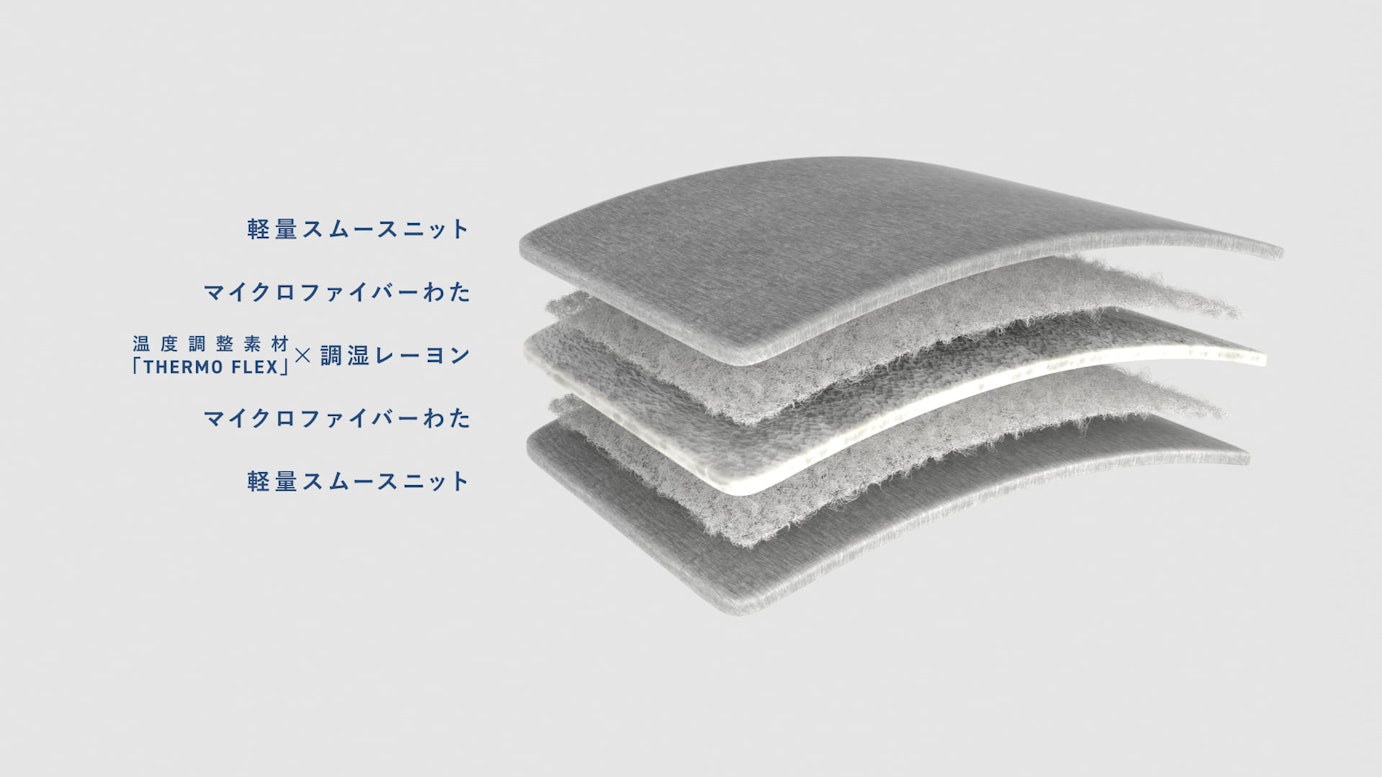 温度調整素材を繊維そのものに溶け込ませた特殊な中わた「THERMO FLEX」が季節の変わり目でもひとりひとりの眠りに最適な温度へ近づけます。調湿レーヨンを使用し、寝苦しさの原因となる蒸れを軽減。高い吸湿性を実現しました。
