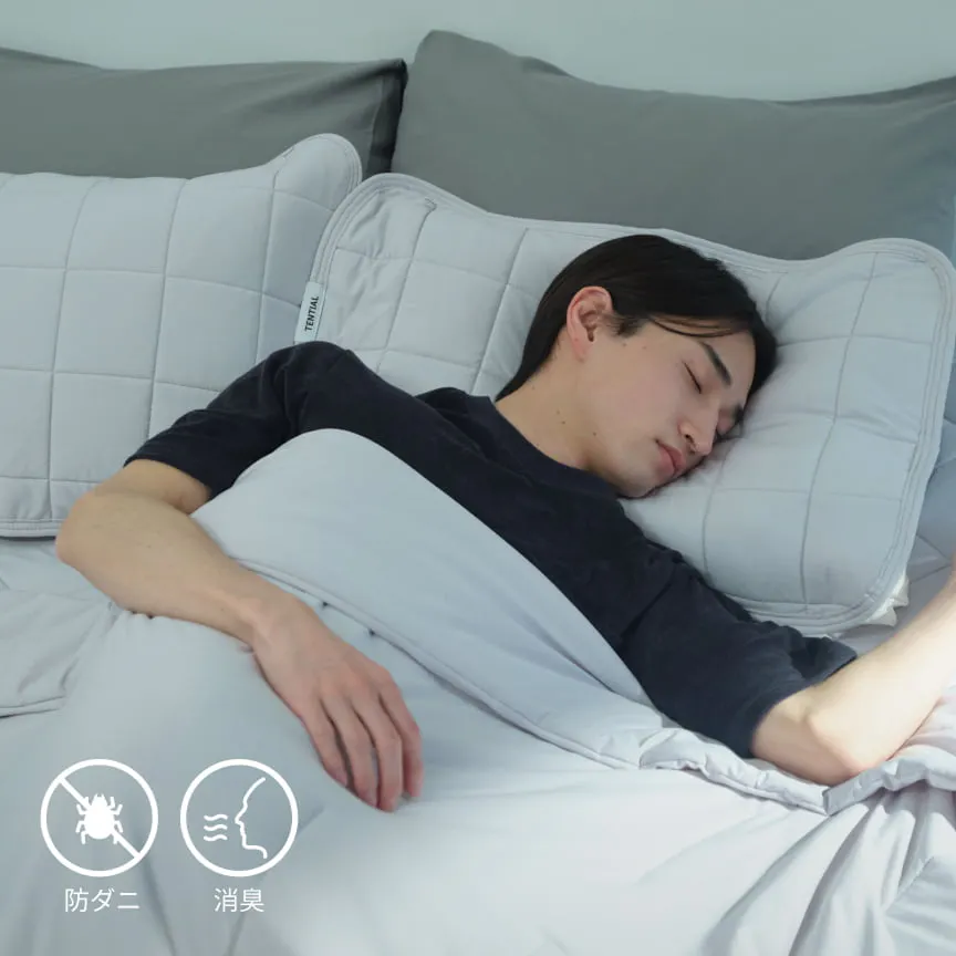 中わたには温度調整素材(PCM)を繊維そのものに溶け込ませたTHERMO FLEXと調湿レーヨン素材を採用しており寝室環境においての寝床内環境を快適な温度にコンディショニング。