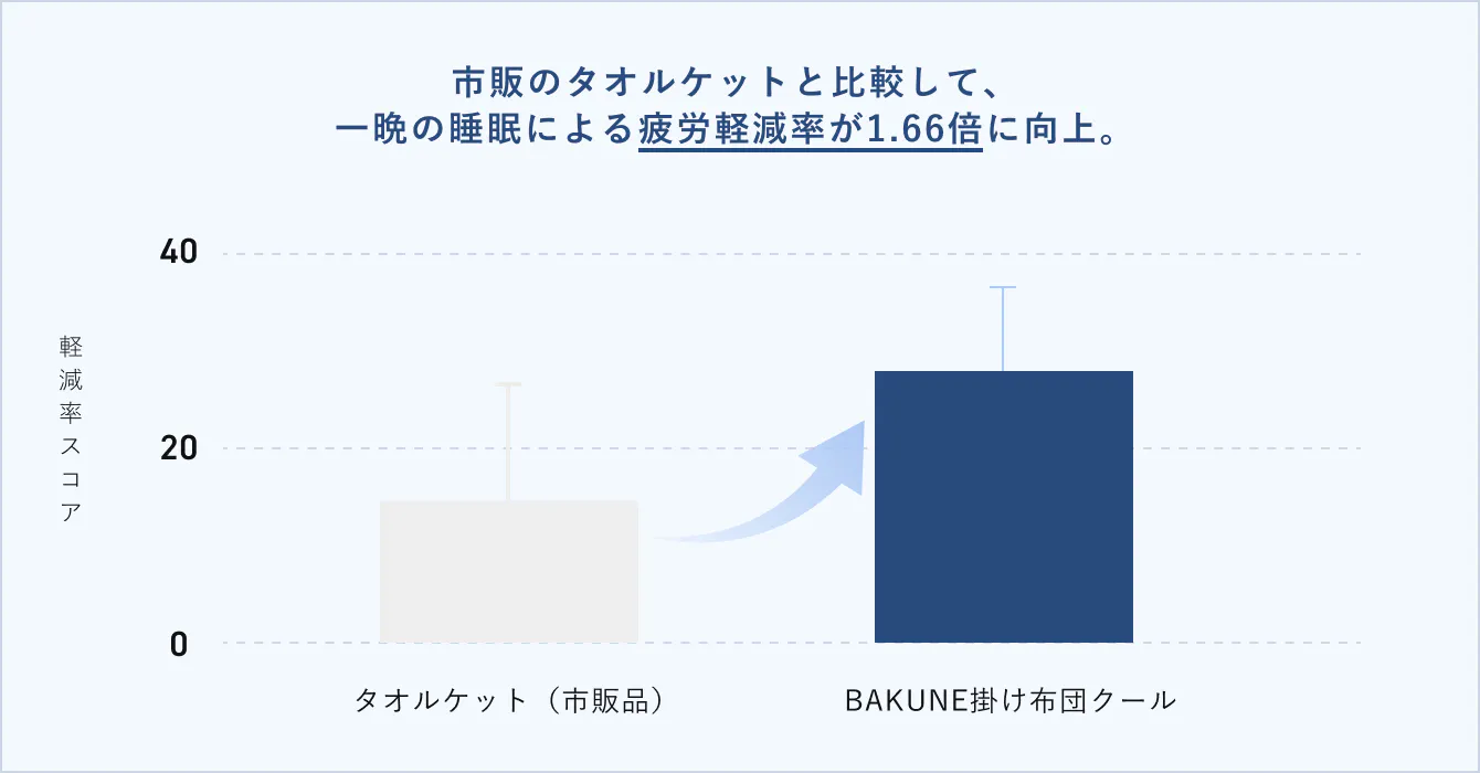 BAKUNE掛け布団クールは、タオルケットと比較して、一晩の睡眠における疲労感の軽減率が高い