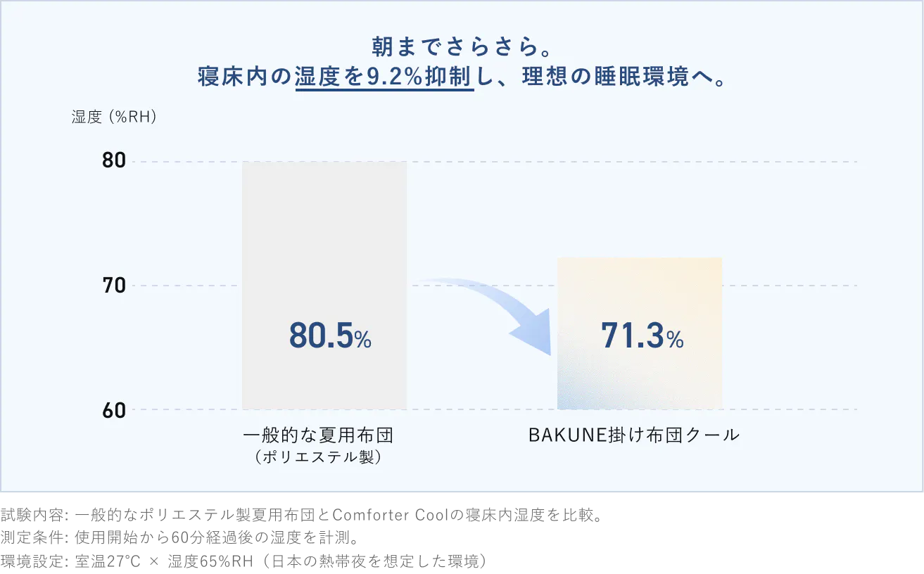 ひんやりニットとの相乗効果でより涼しくさわやかな理想的な寝床内環境へ導き、温度だけではなく湿度に対してアプローチした、次世代肌掛け布団。