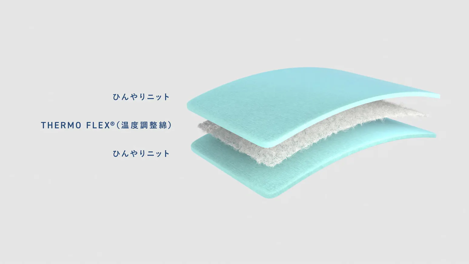表地には接触冷感機能と吸汗速乾機能のあるシルクタッチな肌触りが特徴のひんやりニットを使用。 中綿には温度調整素材「THERMO FLEX®」を使用。また除湿素材「B型シリカゲル」を付着加工を施しています。