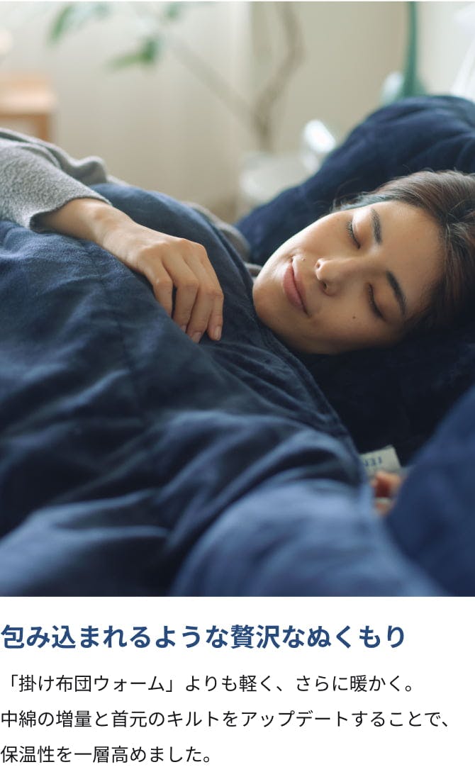 6層構造でさらに進化した快適性。 中わたには、熱を逃さないアルミ断熱シート、やさしく保温するリサイクルダウン、湿気を吸収しながらあたたかさを保つ調整シート、さらに温度調整素材「THERMO FLEX®」を組み合わせ、多層的に心地よいぬくもりを実現。 側生地にはシアバター加工を施したマイクロファイバーフランネル毛布を採用し、なめらかな肌触りで包み込みます。