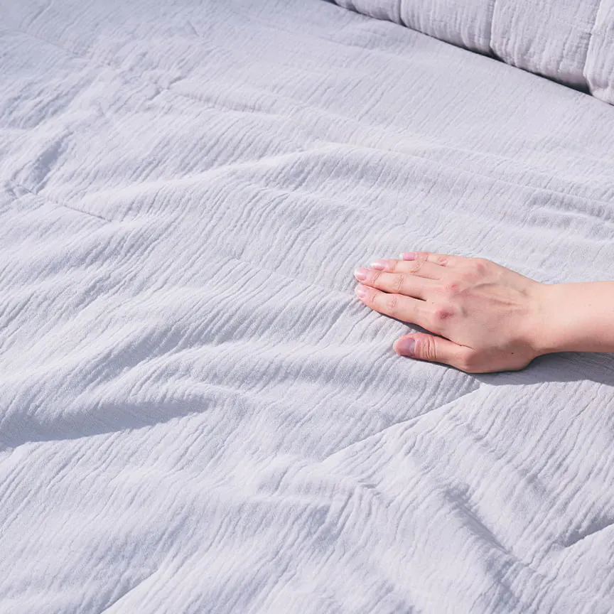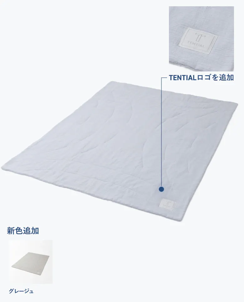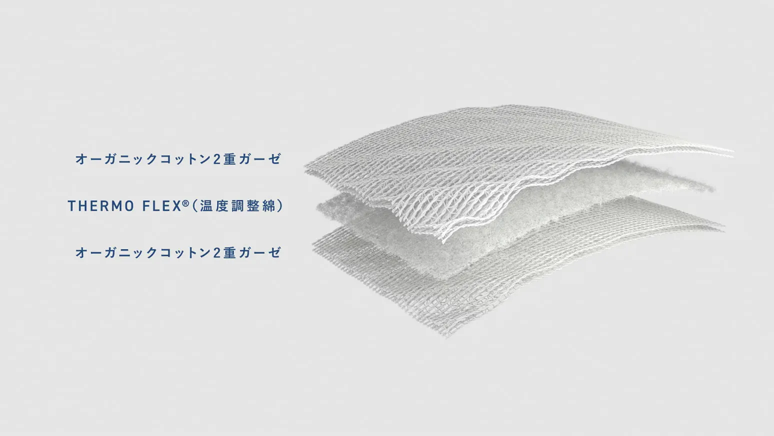 表地と裏地にはインド産のオーガニックコットンを使用し、柔らかく優しい肌触りが特徴な2重ガーゼに織り上げた素材を採用。 中綿には温度調整素材「THERMO FLEX®」を使用。また除湿素材「B型シリカゲル」を付着加工を施しています。