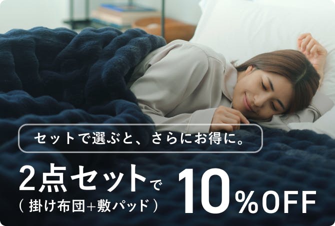 6層構造でワンランク上の心地よさを実現。 中わたには、熱を閉じ込めるアルミ断熱シート、温度調整素材「THERMO FLEX®」、さらに調湿レーヨンを加えることで、眠っている間の汗による蒸れ感を軽減しながら快適な保温性をキープ。多層的にバランスよく温度と湿度をコントロールします。 側生地には、表地に毛足の長いラビットファー調素材を採用し、手触りの良さと高い保温性を両立。裏地にはマイクロファイバー毛布を使用し、やわらかな肌当たりで心地よく包み込みます。