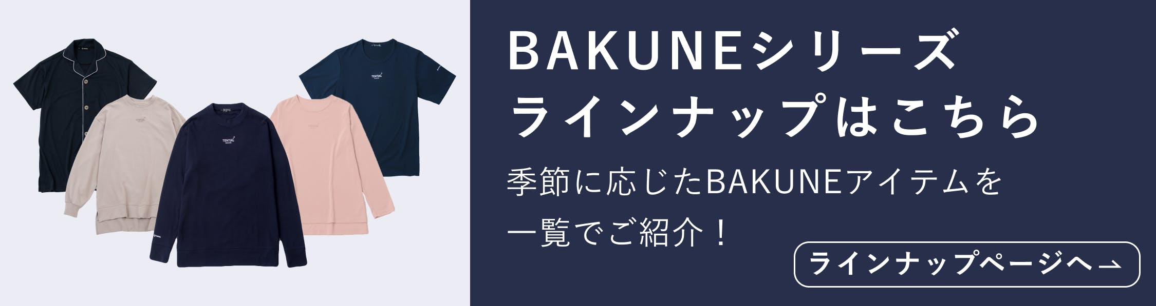 リカバリーウェアBAKUNEは、着るだけで血行を促進し、疲労回復することで健康的な毎日を支える睡眠用ウェア。さらに快適な眠りに特化した独自の設計で、毎日の健康に重要な「睡眠」をサポートします。