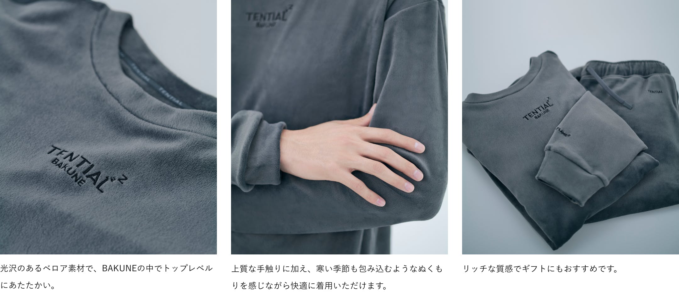 高級感のあるたたずまいと保温性を兼ね備えた、「BAKUNE ベロア」。なめらかな肌触りが特徴のトリコットベロア生地を使用しています。大切な方への冬のギフトにもどうぞ。
