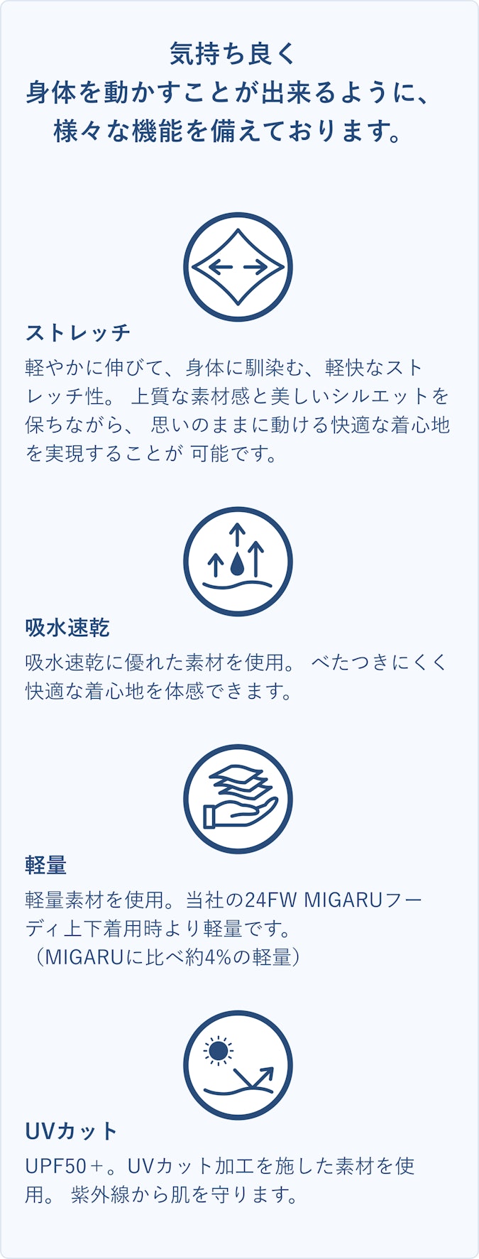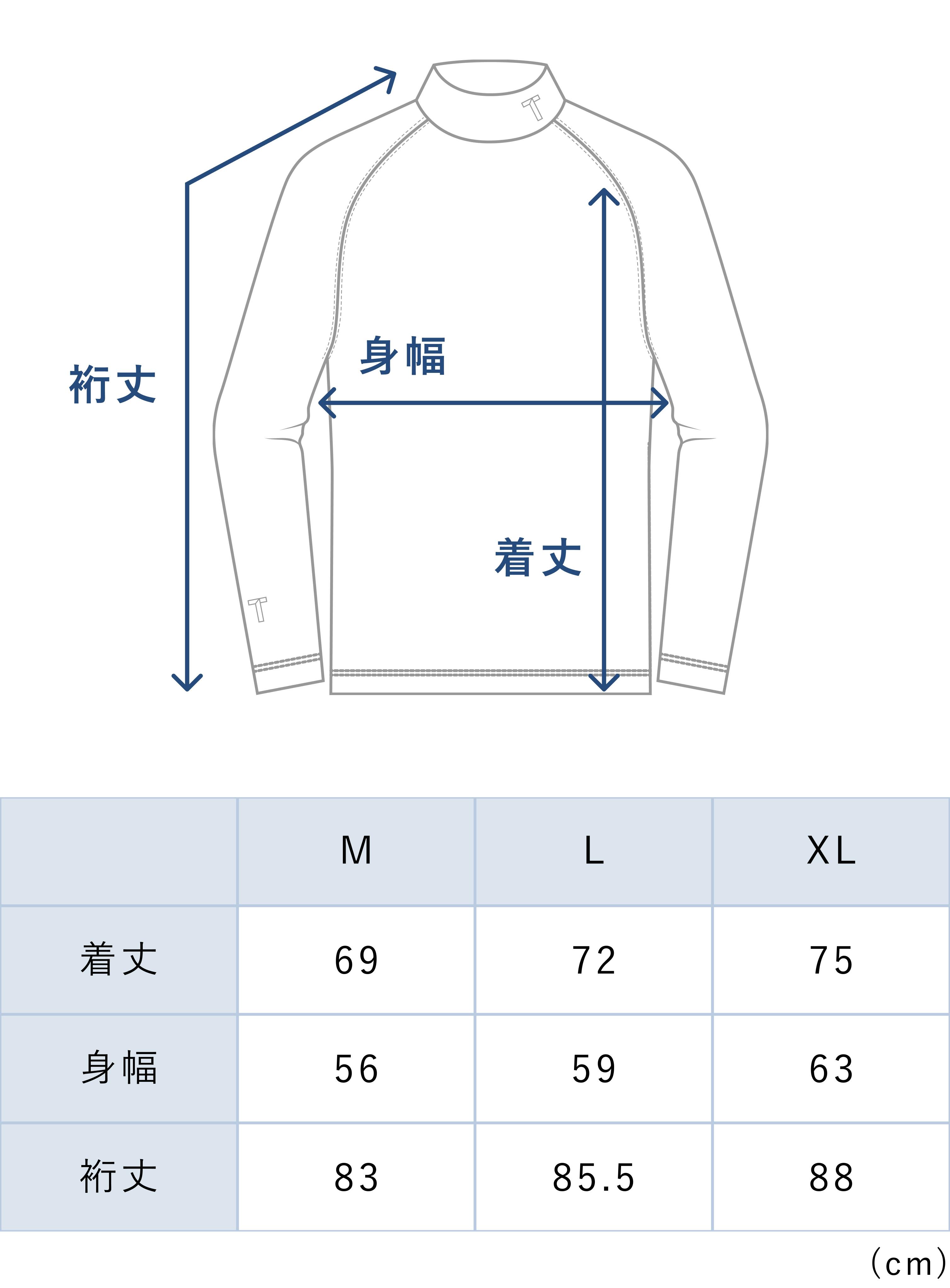 寒い季節でも吸水速乾性のある素材を活用することで温かさをキープし、強い紫外線から身体を守る為、紫外線防止指数最高値の「UPF50+」の水準を満たしています。