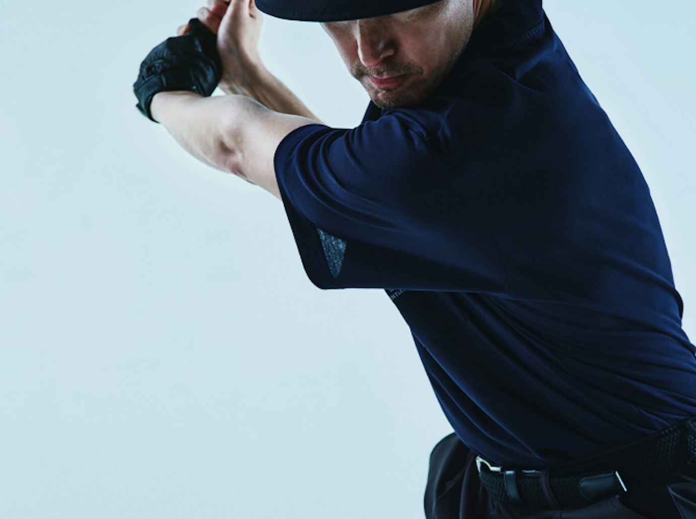 ゴルフのプレー中、身体に纏う「ギア」だからこそ、より快適に着てほしいという想いから、ストレッチ性の高い素材と合わせてゴルフの動きに特化したパターン設計にしています。※こちらの画像は「Short Sleeve T-Shirt Mock Neck+Chino Long Pants」にて撮影したものになります。