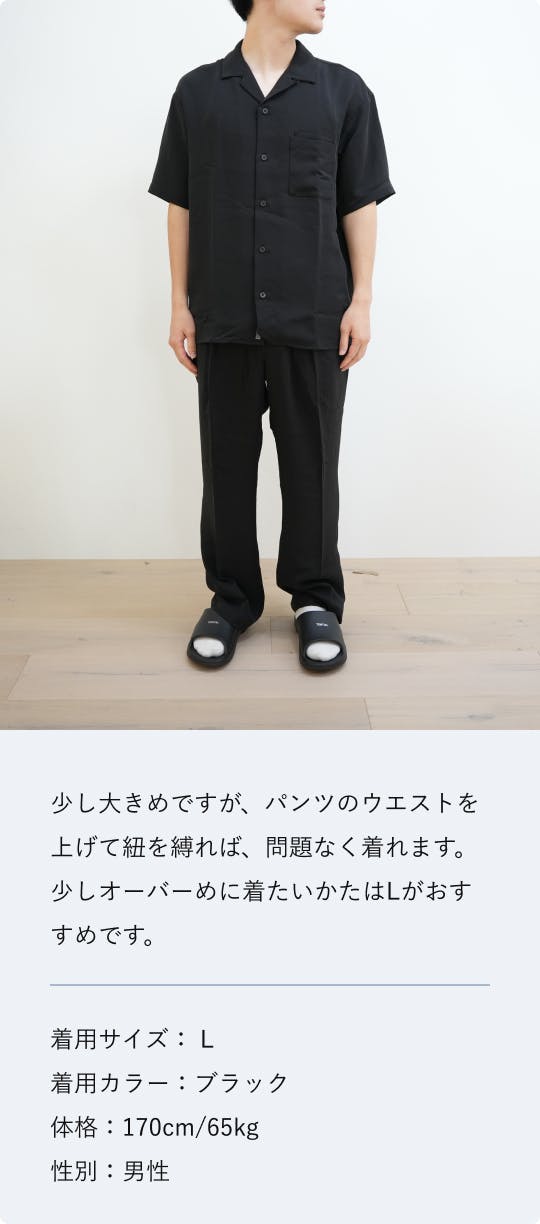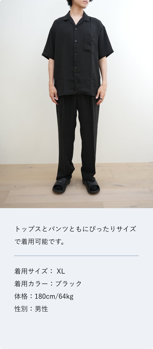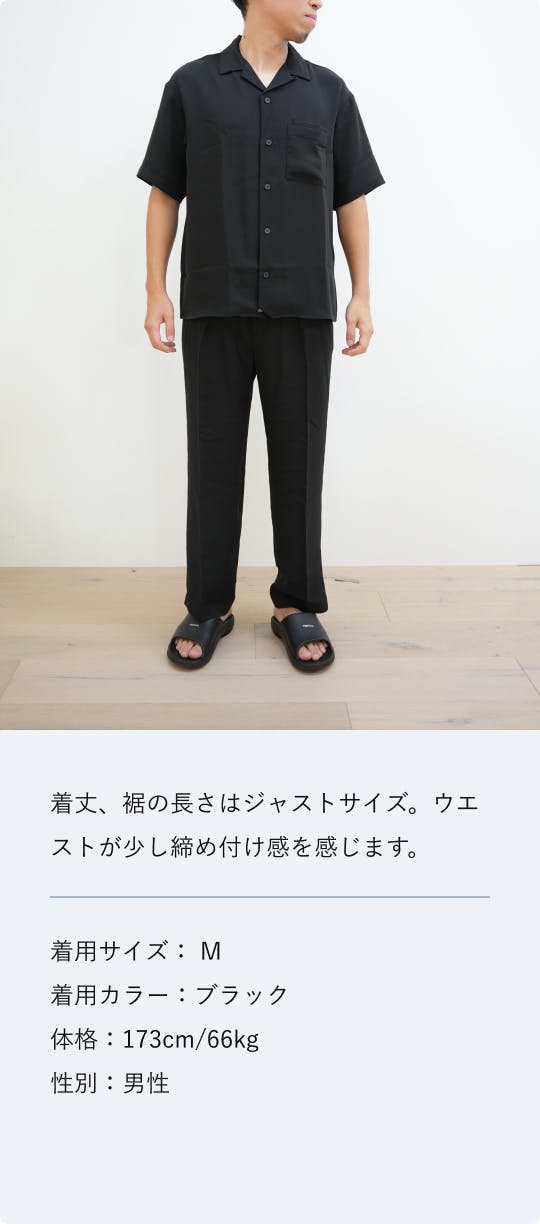 ゆとりのあるスラックスシルエットをベースに、ヒップやワタリ部分に余裕を持たせた、リラックス感のあるデザイン。生地の特性を活かして、ルーズになりすぎず、エレガントな印象に仕上げています。※ポケットのバックポケットは、型崩れ防止のため「仕付け糸」で仮縫いをしています。こちらの「仕付け糸」は外してご着用いただくことが可能です。