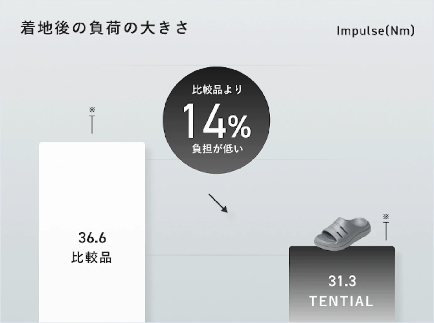 本製品は高いクッション性により、着地時の衝撃をやわらかく吸収。歩行中の足への負担を軽減することが確認されました。