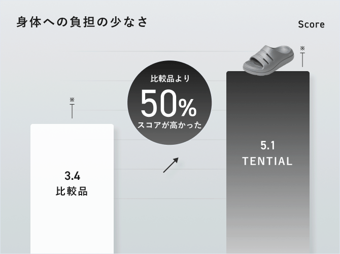 本製品は高いクッション性により、着地時の衝撃をやわらかく吸収。歩行中の足への負担を軽減することが確認されました。