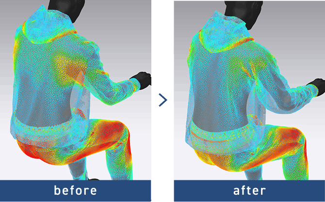 肩周りや腰回りに圧力がかかりにくいようにパターンを調整、ストレッチ性もあり長時間のパソコン作業でも快適に。CLO Virtual Fashion, Inc. owns all rights to the avatar displayed. https://www.clo3d.com/